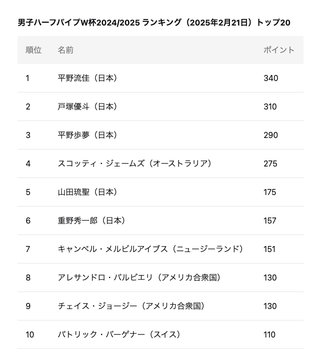 A:男子ハーフパイプW杯2024/2025シーズンのランキングでは、平野歩夢選手は2025年2月21日時点で3位につけています。