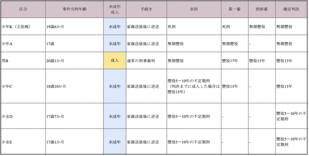 - 主犯格Kには第一審で死刑判決が言い渡されたが、控訴審で無期懲役に減刑され、無期懲役が確定。